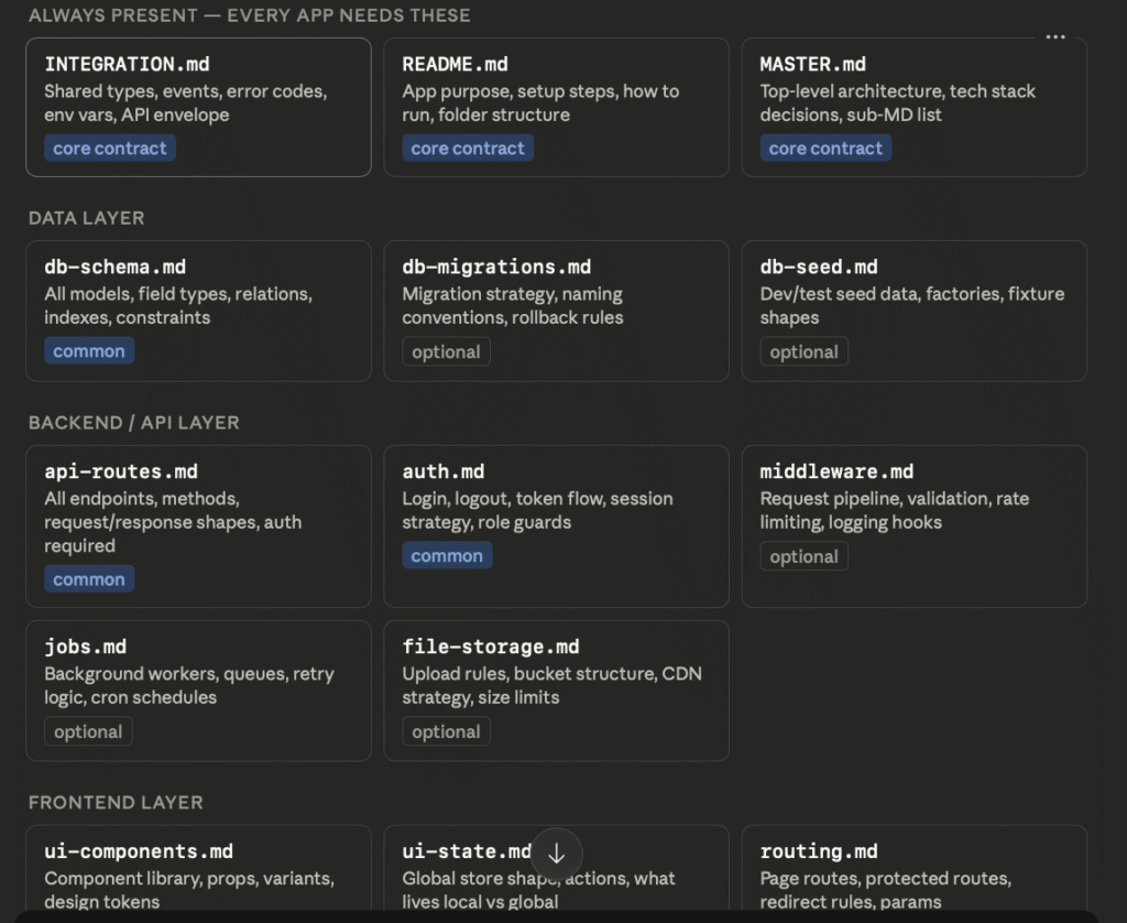 This is a Claude generated diagram of the md files that it would look to build out for a production app.  Each md file here would be generated from a top level Claude prompt with subsections describing the work the programming agent will execute.  It is infeasible to properly describe the app capabilities in a simple Claude file so this framework is just a start to going into depth of the product requirements.